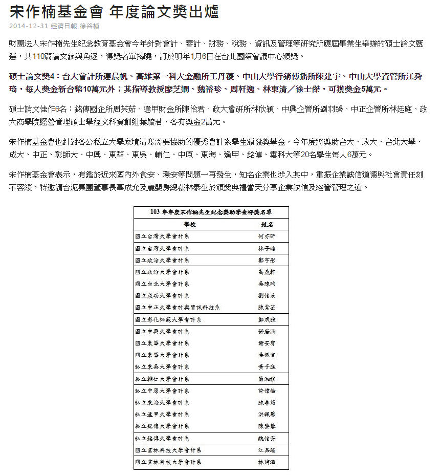 財團法人宋作楠先生紀念教育基金會今年針對會計、審計、財務、稅務、資訊及管理等研究所應屆畢業生舉辦的碩士論文甄選,共110篇論文參與角逐,得獎名單揭曉,訂於明年1月6日在台北國際會議中心頒獎。