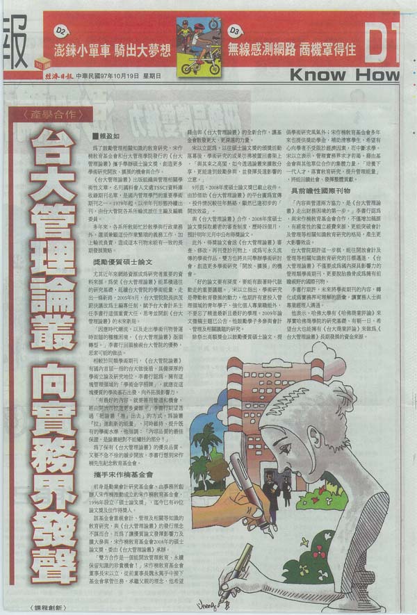 財團法人宋作楠先生紀念教育基金會於民國七十五年由勤業會計師事務所創辦人宋作楠先生與資深同仁發起成立,本著回饋社會、推動我國會計、審計、財務、稅務、資訊,管理及相關等知識之教育及研究為宗旨,設有「碩士論文獎」,及「宋作楠先生紀念獎助學金」每年贊助優秀論文作...<詳全文>